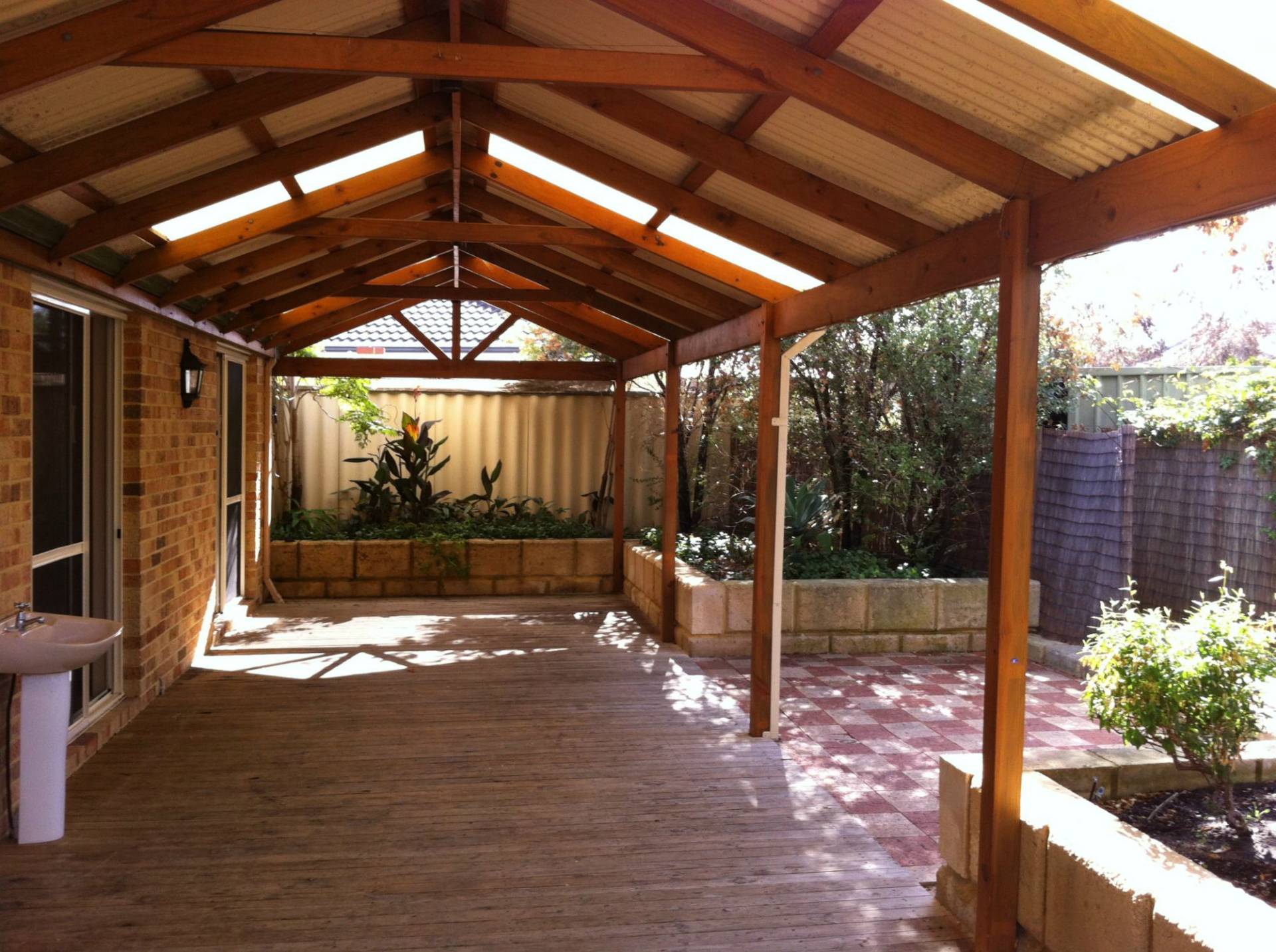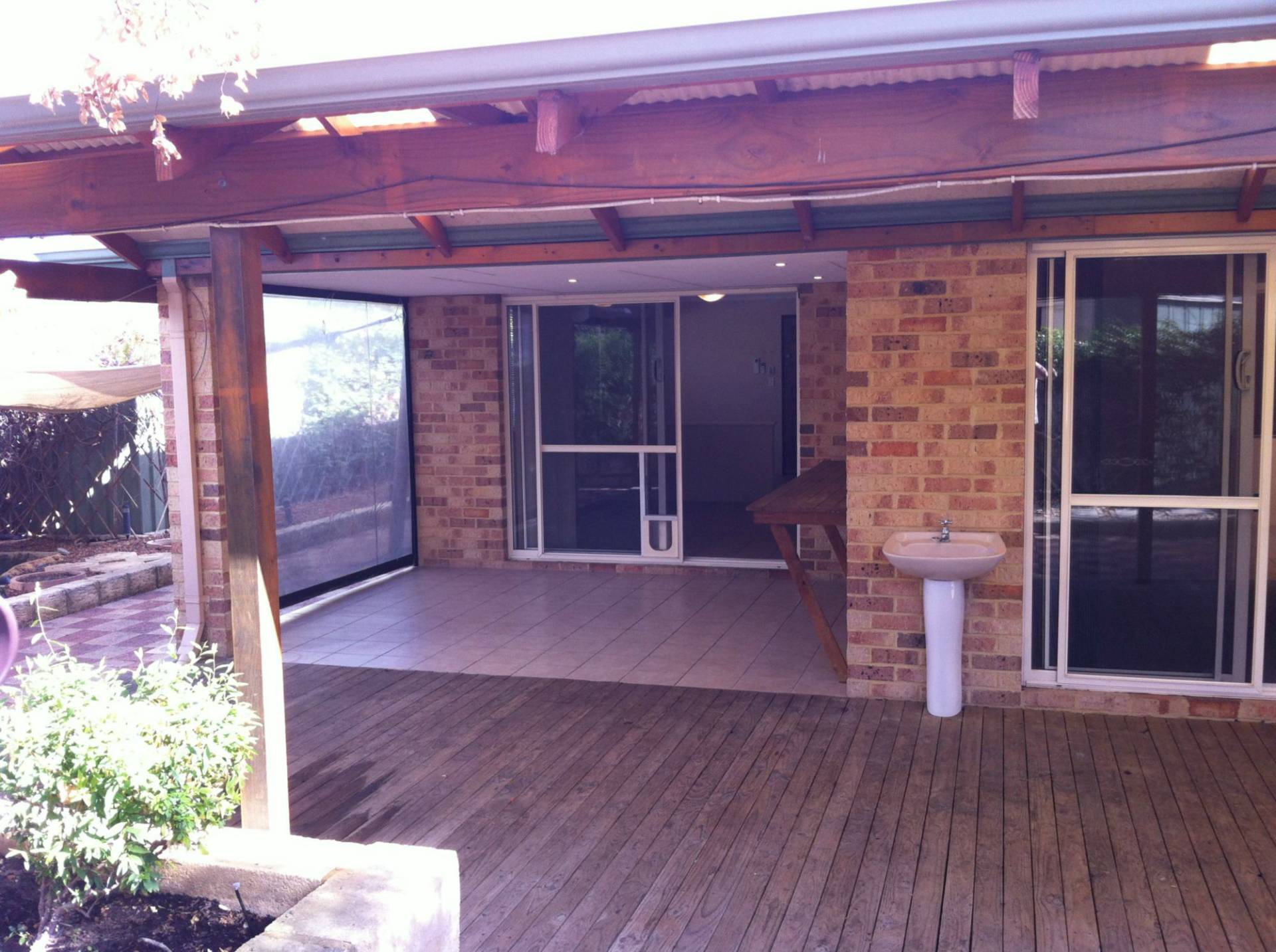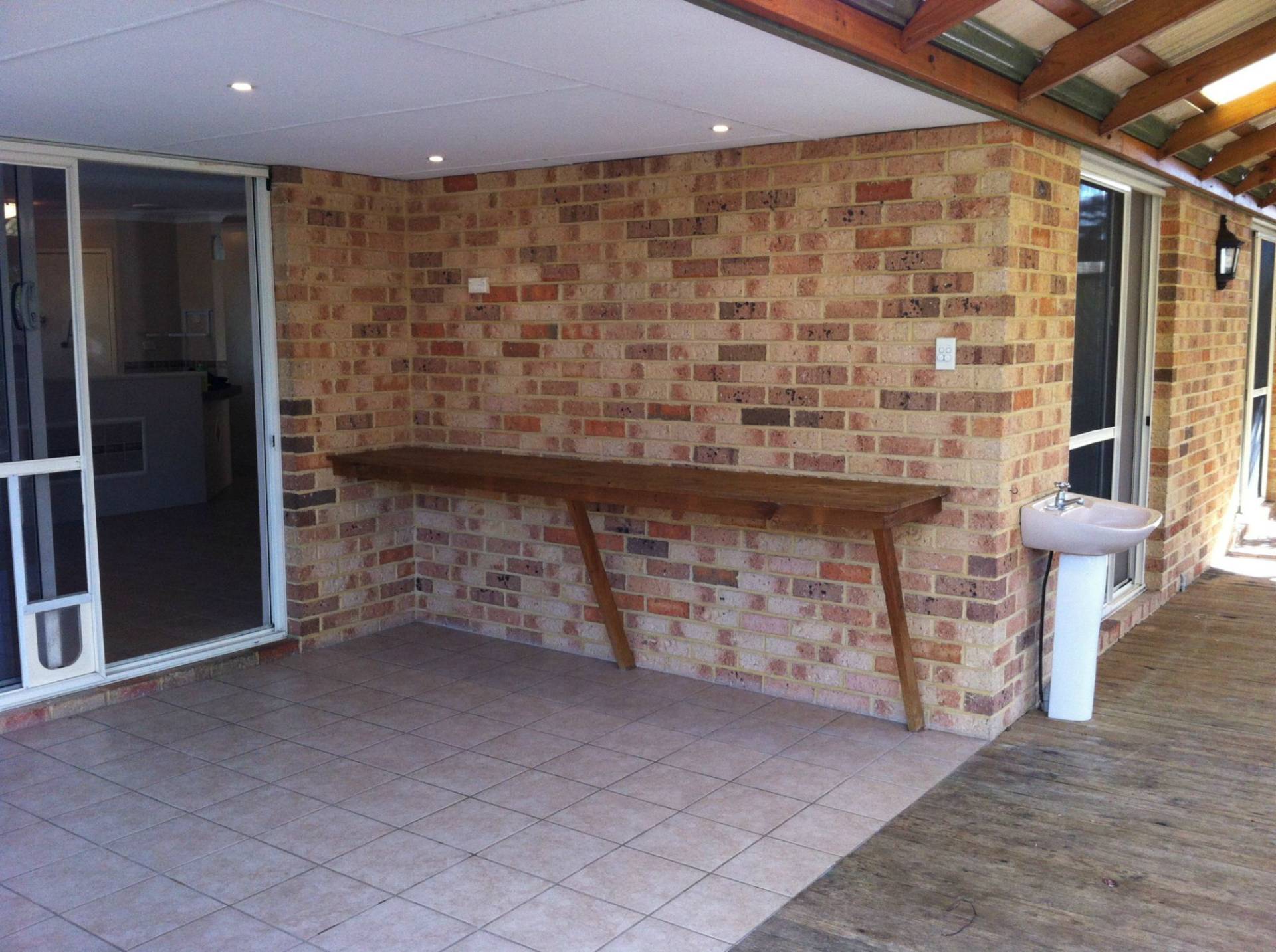 - Outdoor area has built in timber bench, cafe blind and basin with cold water tap
