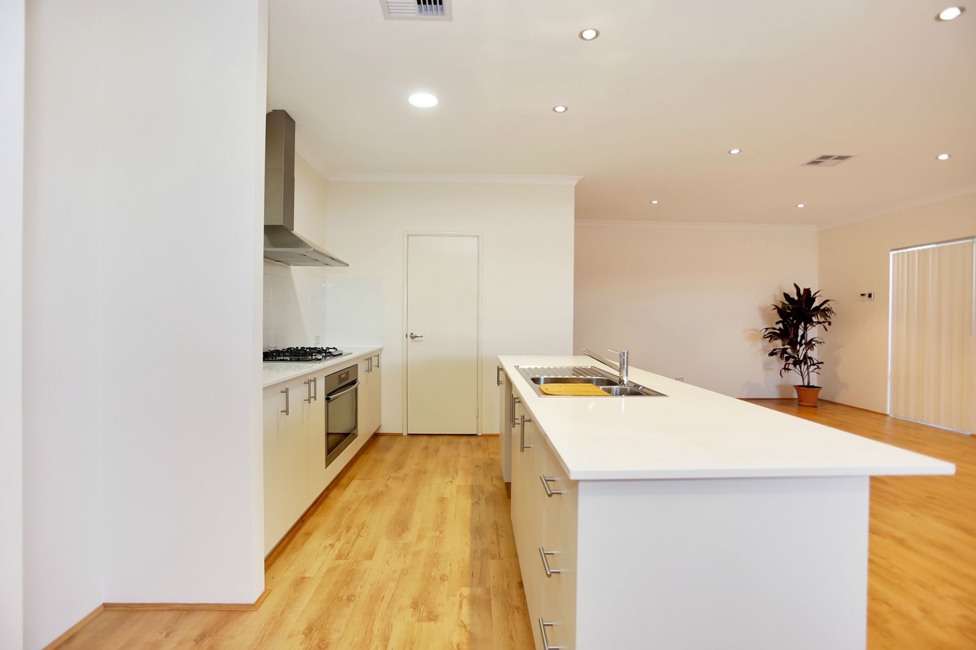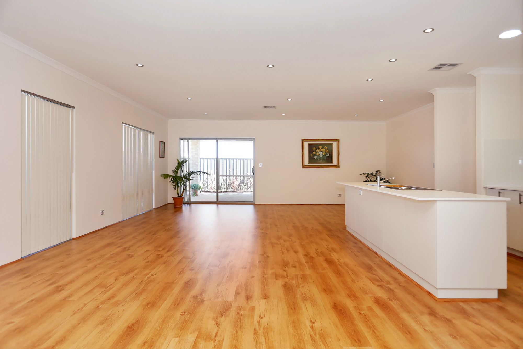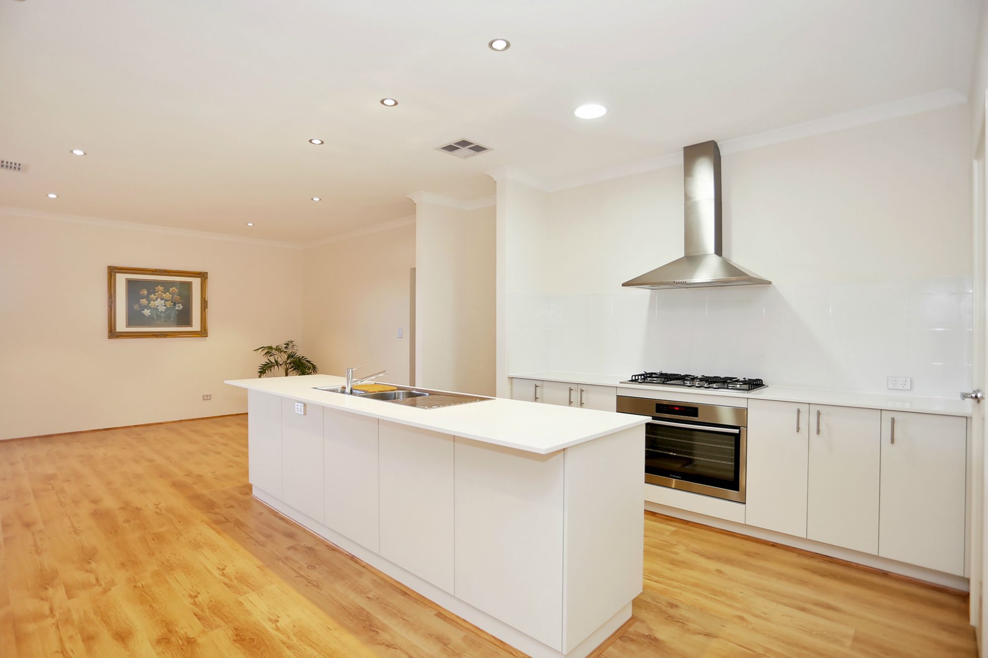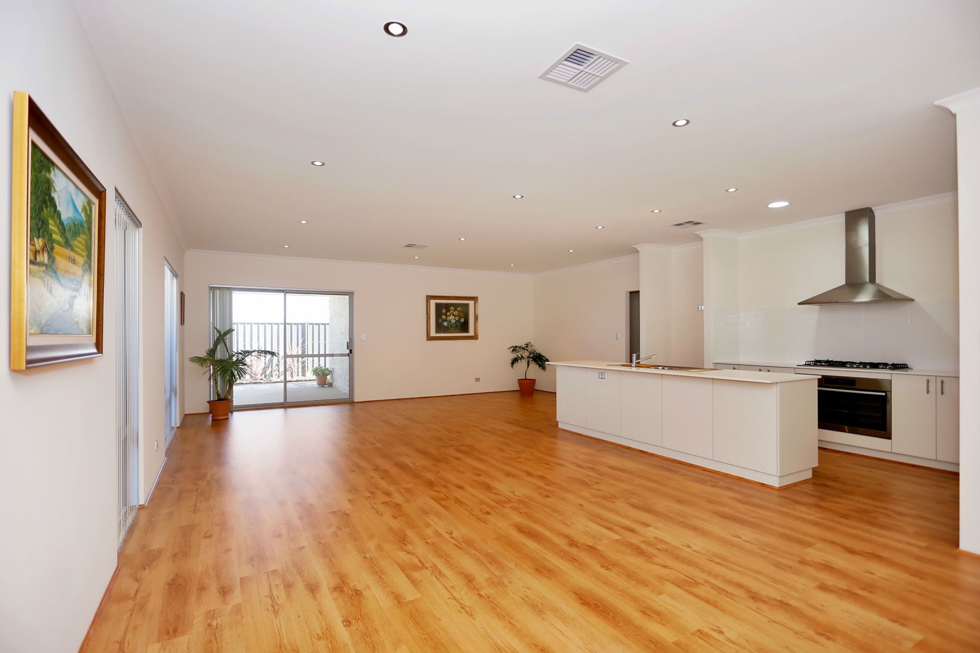 • A large open plan with a chef kitchen, with modern appliances, ample drawers and shelves, pantry, big oven and stove top, space for dishwasher