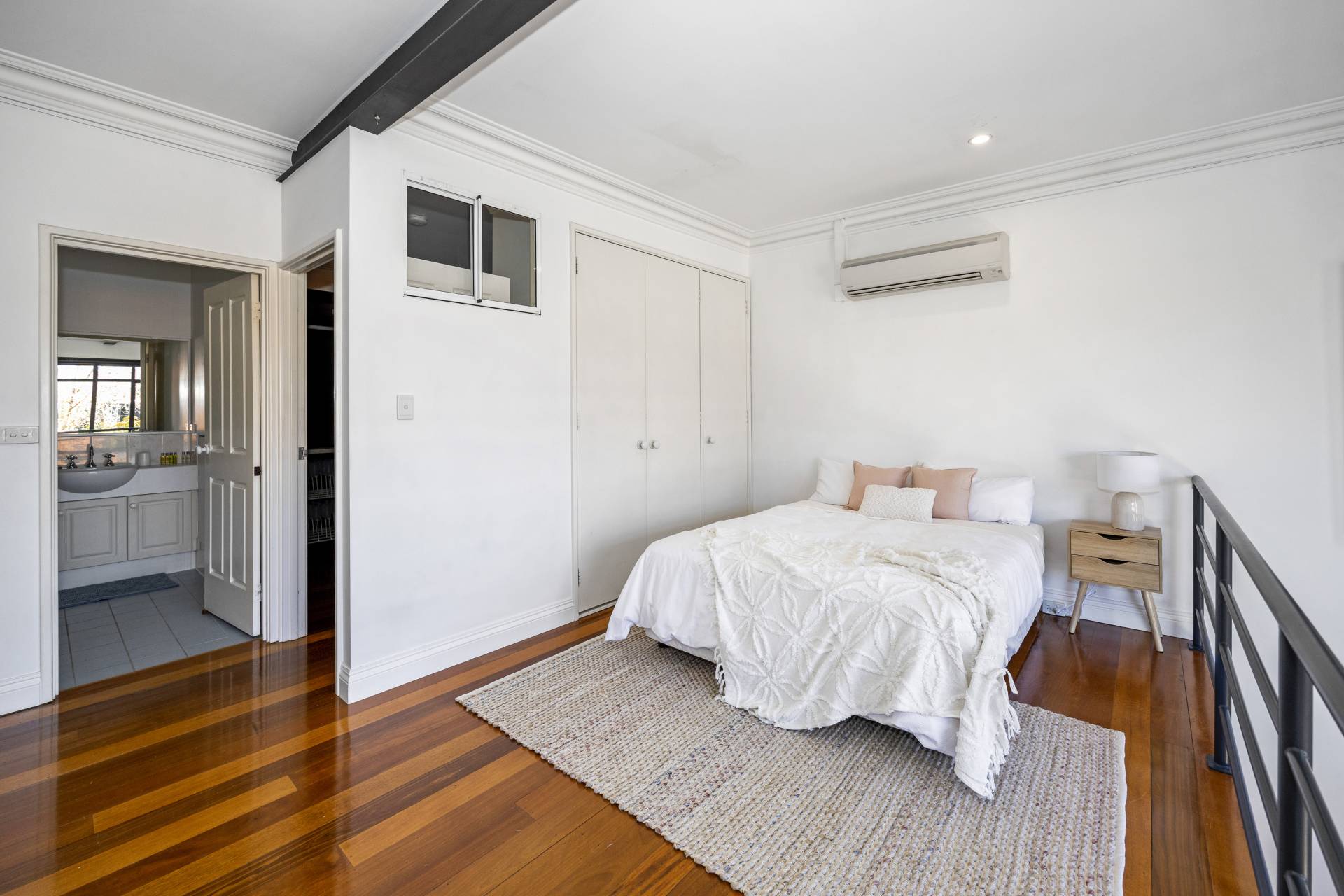 Upstairs bedroom on mezzanine level, built in wardrobe, bathroom and toilet
